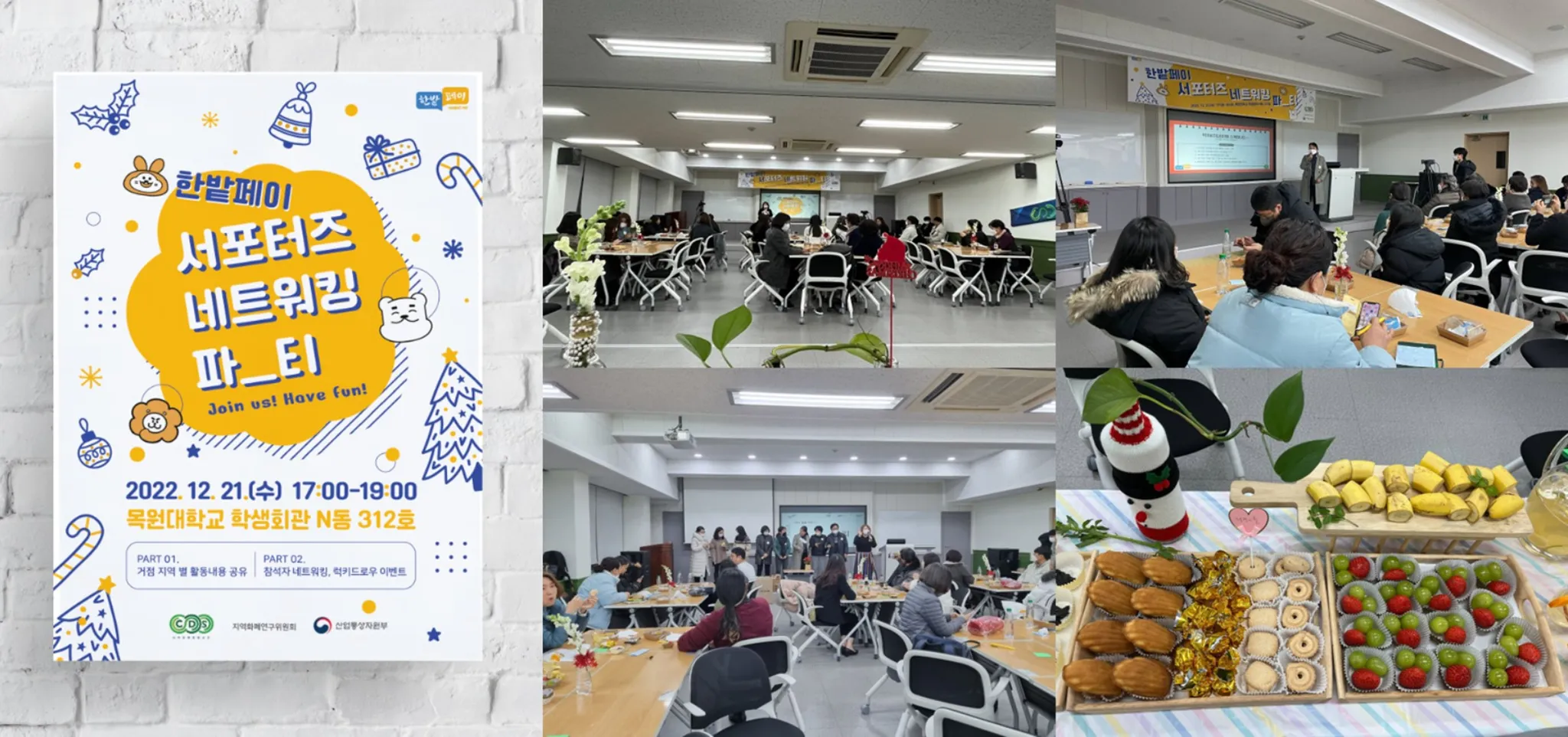 2022년 한밭페이 거점 별 활동사항에 대하여 한밭페이 소비자이자 서포터즈의 역할을 수행하고 있는 가입자를 대상으로 공유하고, 2022년 성과에 대한 축하, 서포터즈의 역할을 지속할 수 있도록 브랜드로열티 강화, 소비자 간 네트워킹 워크숍을 파티의 형태로 운영하였습니다.