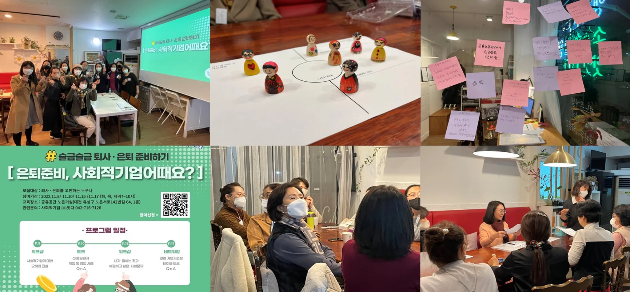 사회적경제 영역에서의 활동에 대한 이해를 돕기 위하여 은퇴 후의 삶을 계획하고 있는 지역의 중장년층을 대상으로 사회적경제 은퇴아카데미를 진행하였습니다. 기존에 가지고 있던 사회적 경제에 대한 오해를 덜어내고 지역에서 활동할 수 있는 동기를 만드는 과정으로 운영하였습니다.
